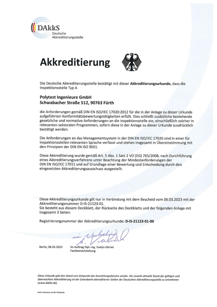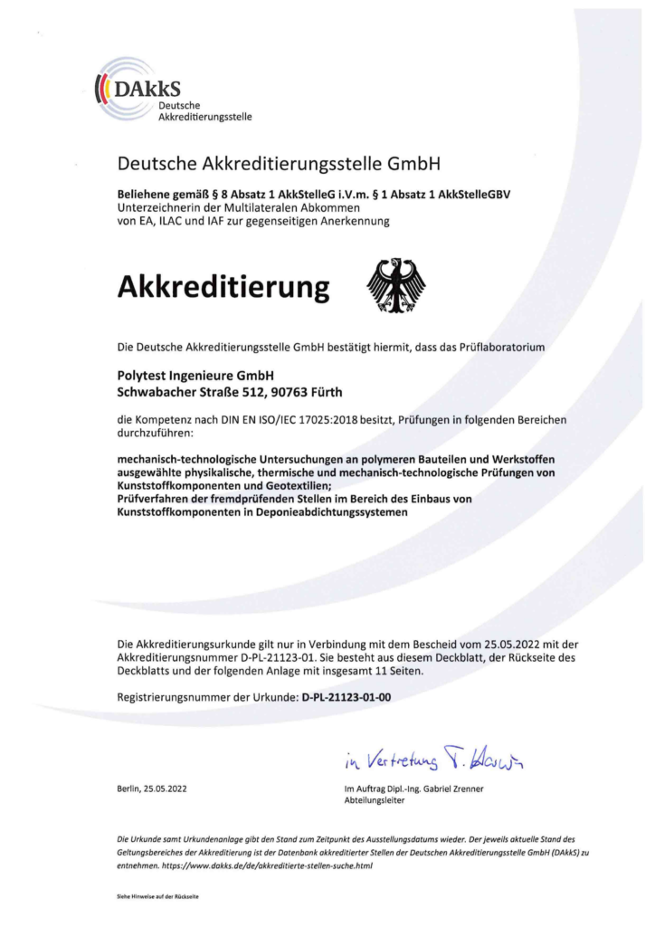 Zusätzlich sind wir von der DAkkS als Inspektionsstelle Typ A unter der Nummer D-IS-21123-01 nach DIN EN ISO 17020:2012 für den Bereich „Dichtungsmaßnahmen unter Verwendung von Kunststoffprodukten bei Deponiebaumaßnahmen hinsichtlich ihrer Übereinstimmung mit festgelegten und – aufgrund einer sachverständigen Beurteilung – mit allgemeinen Anforderungen“ akkreditiert. Unsere Urkunde und die Anlage dazu können Sie hier herunterladen:
